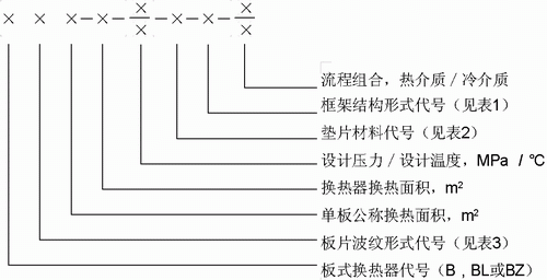 注:1、框架結(jié)構(gòu)形式為 Ⅰ 時(shí),框架結(jié)構(gòu)形式可省略。 2、B-板式換熱器代號(hào);BL-板式冷凝器代號(hào);BZ-板式蒸發(fā)器代號(hào)。 3、流程組合都為單時(shí)可省略。 |